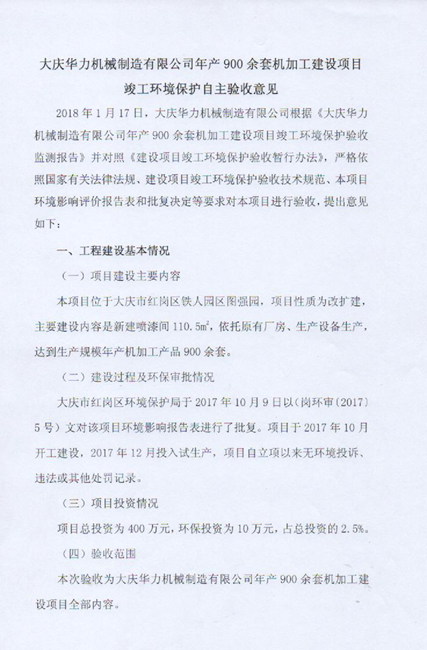 大慶華力機械制造有限公司年產(chǎn)900余套機加工建設項目自主驗收公示